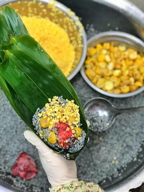 老板娘在包粽子时,手法非常独特。她先将糯米浸泡,再与五花肉、蛋黄等食材混合,最后用粽叶包裹。这样的制作工艺,使得粽子口感鲜美,香气扑鼻。
